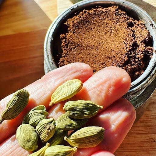 Ayurvedic tip to reduce the heating element of coffee – Cardamon pods in coffee reduce the rajasic quality of the coffee due to the sattvic quality of cardamon. Cardamon is also proven to be excellent for freshening breath and improving the mouth microbiome. The quality of the mouth microbiome gives rise to a high-quality lung microbiome.