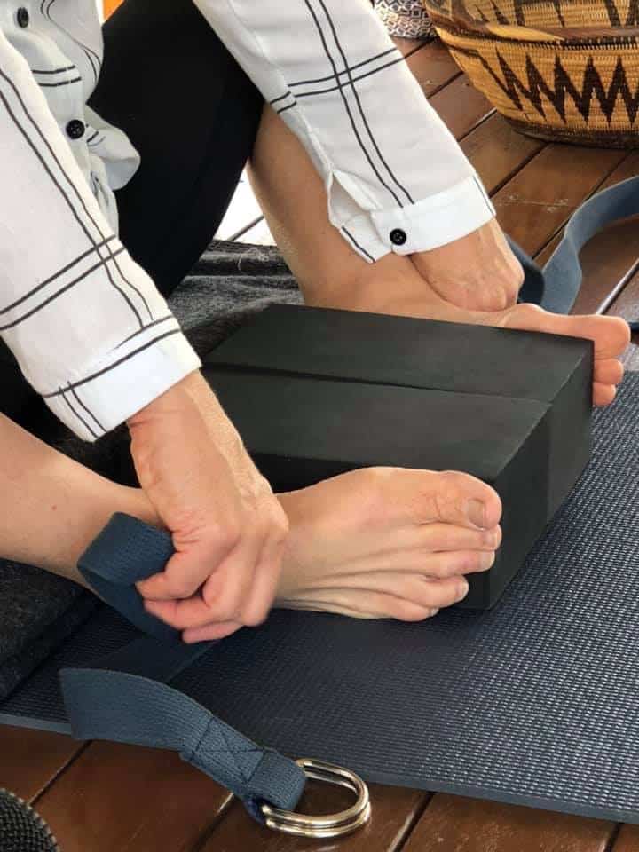 Add one or two bricks between the feet and loop a belt around both for a much deeper inner thigh stretch.